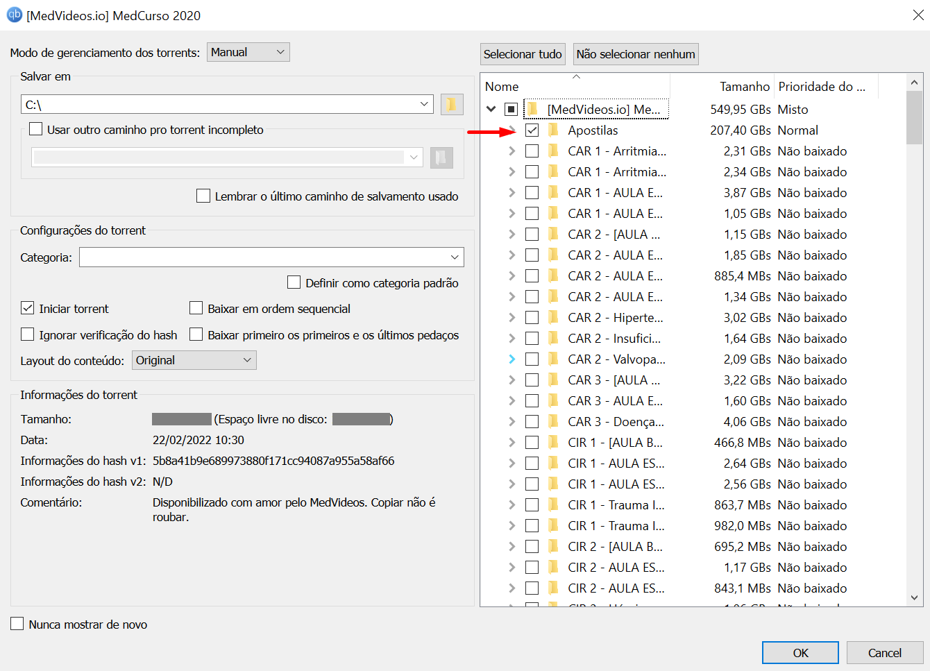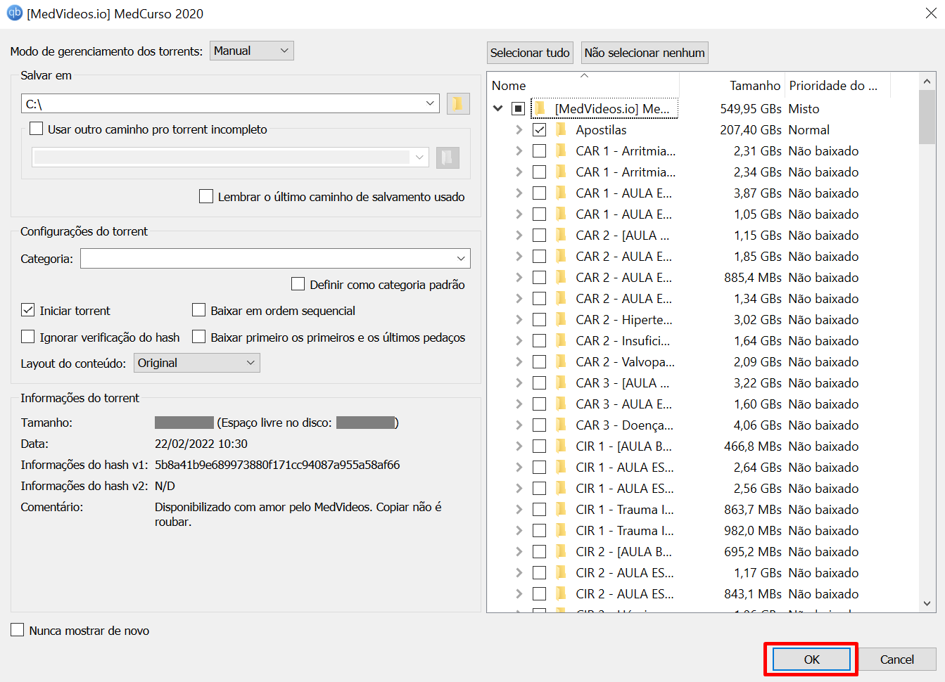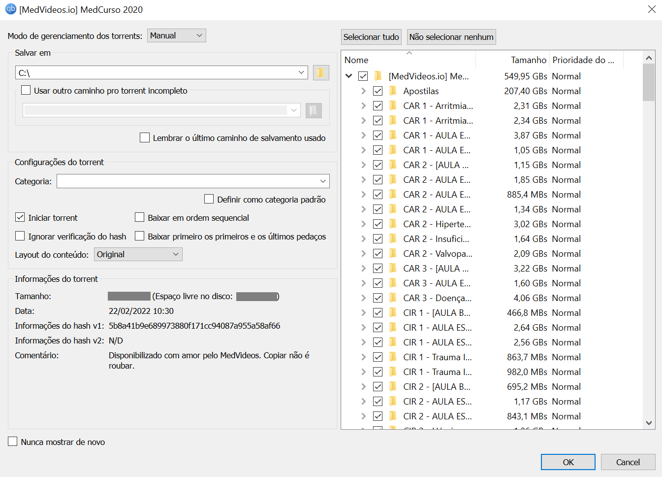 3) Abra o arquivo .torrent. Se você completou o passo 1 corretamente, o qBitTorrent abrirá automaticamente. Você se deparará com uma janela semelhante à imagem abaixo.